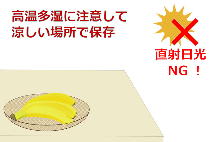 バナナは基本的に常温で保存します。ただし気温の高い部屋に置いておくと鮮度の低下が早まりどんどん黒くなっていくので、なるべく涼しい場所に置いておくようにしましょう。特に夏場は直射日光を避け、できるだけ冷暗所での保存を心がけてください。