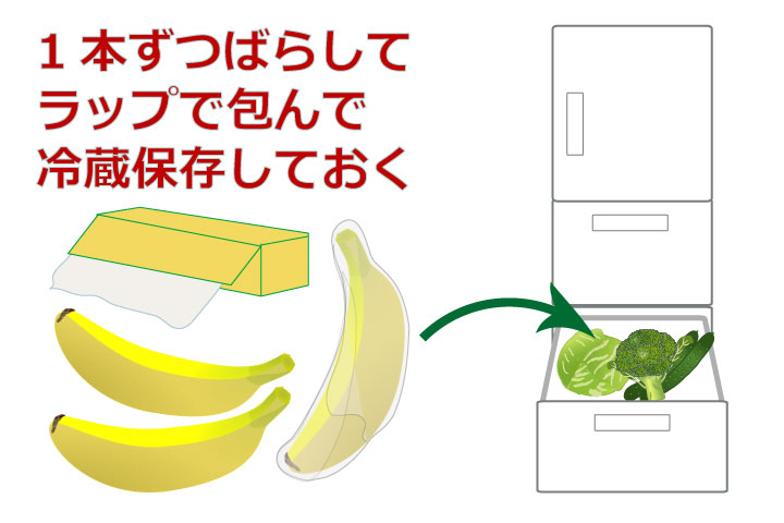 ただし、全体が緑色の未熟なバナナを冷蔵すると追熟しないので、黄色くなってから冷蔵してください。また冷蔵していたバナナは常温でしばらく追熟させると、甘味とやわらかさが出てよりおいしく味わえます。
