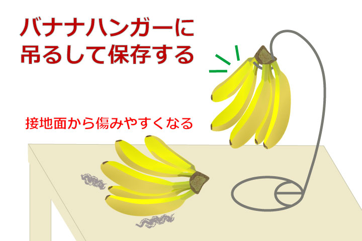 完熟バナナは皮の接地部分から傷みやすくなります。そのため少しでも接地面を少なくするために「バナナハンガー(バナナスタンド)」に掛けておくという方法もあります。