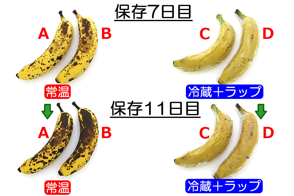 1週間後の常温保存「A」「B」は、見た目がおつとめ品のようになっていますが、完熟状態なので食べるとおいしいはず。でもこのまま実験を継続します。冷蔵「C」「D」はまだシュガースポットが見られません。そして11日目になると、常温「A」「B」は黒い割合が増えたので終了としました。冷蔵「C」「D」はこの時点でもさほど変化はありません。