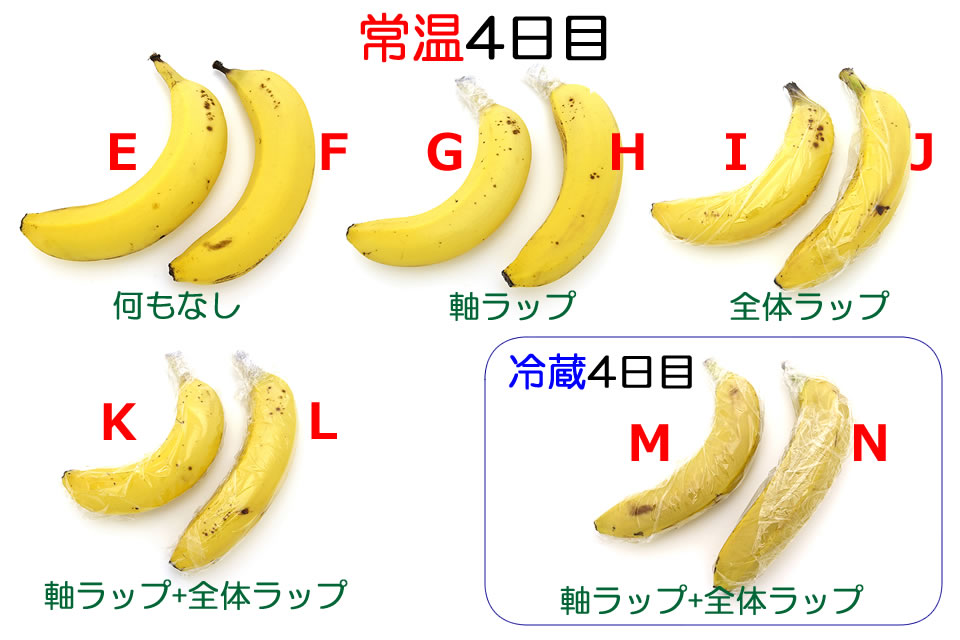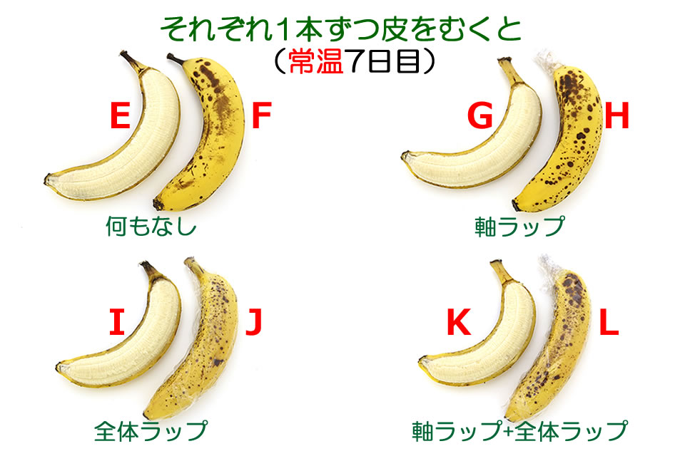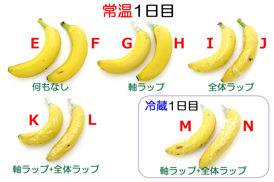 この実験で使用したバナナは10本。「E」と「F」の2本は何もせずそのままの状態で常温保存。そして「G」と「H」は軸にラップをして常温保存。「I」「J」は全体にラップ、また「K」と「L」は軸にラップをしてからさらにラップで全体を巻いて常温保存をします。これと同様にもう1組軸ラップ+全体ラップの「M」と「N」を用意し、この2本は冷蔵庫の野菜室で保存してみました。