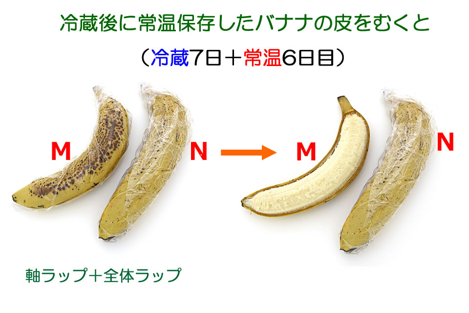 軸ラップの有無に関わらず、常温保存7日目のすべてに同じくらい多くのシュガースポットが出て食べ頃になってしまいました。なお、冷蔵7日目は少し色がくすんでいる程度